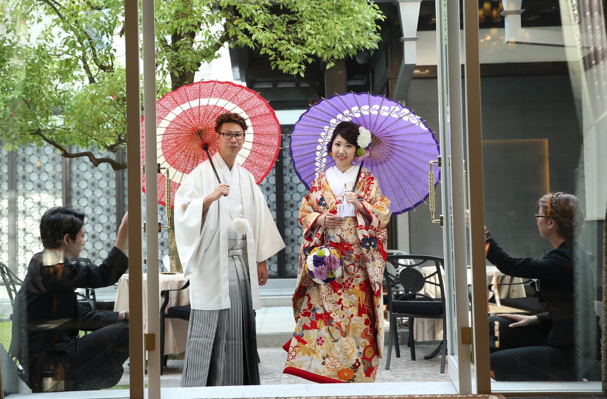 再入場はサプライズでガーデンから入場!!入場前は「どこから入場してくるのかなぁ?」と皆様キョロキョロされていました!サプライズ大成功です^^せっかく和装での入場なので、番傘を持ち凛としたお姿で皆様へご挨拶に向かいます。鳳明の会場だからこそ。和装での入場はおススメです☆