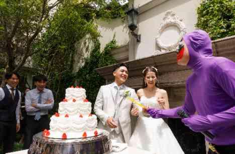 アットホームな雰囲気でガーデンでのケーキ入刀♡ 皆様と近い距離でのケーキセレモニーは温かみがあり素敵な瞬間でした。 歯科衛生士の新婦様はファーストバイト後に歯ブラシをしたい!でも普通におこなっても…との思いからご友人がバイキンマンとなり登場され歯ブラシをされる演出を!! 大変盛り上がるひと時となったことと思います。