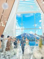 挙式後は併設のセレモニーテラスで、桜島を背にしたフラワーシャワーや記念写真を楽しめます。青い海と広い空を背景に、祝福と笑顔があふれる特別な時間を。大切なゲストと幸福を分かち合える、開放感いっぱいのアフターセレモニーを提案いたします。