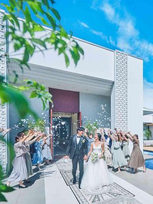アフターセレモニーの舞台は、太陽の光がきらめくと水とウッドのテラスで。真っ青な空と水が織りなす心地よい空気の中、ゲストと共に特別なお時間を。