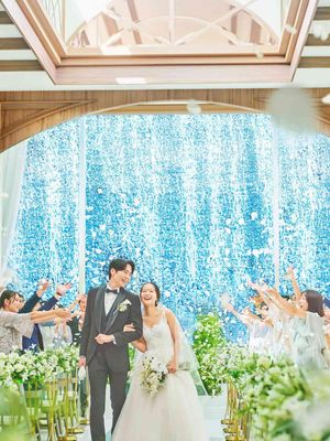やわらかな自然光が純白のバージンロードを照らす、ザ・ピーク プレミアムテラスのチャペル。祭壇の前で緊張して待つ彼の肩をそっと叩く。振り返った瞬間に溢れる、愛おしさに満ちた表情。光に包まれたこの美しい場所だからこそ、ふたりだけの誓いの時間は、より一層忘れられない宝物になります。