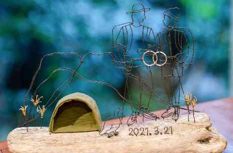 おふたりらしさを出したい、キリスト式になじみが薄いというご理由で人前式を選択。 ここでもテーマモチーフである「登山」が大活躍! 流木とワイヤーでおふたりの登山姿を再現したリングピローに、 「ウェディングマウンテン」と名付けた証明書にゲスト全員の署名をいただくなど、 おふたりらしさを前面に感じられるアットホームな時間になりました。