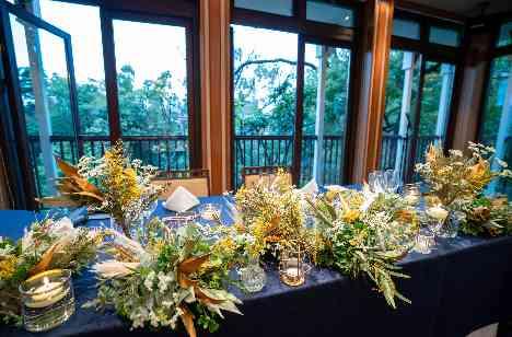 披露宴会場は、どのようなコーディネートとも合うように計算しつくされた、匠の技巧が施された”ほんもの”の空間。この”ほんもの”の空間と、オーダーメイドの「山ウエディング」コーディネートが相まって世界にひとつだけの空間をお楽しみいただきました。 全面に広がる窓からは、四季折々おふたりの大切な当日だからこその風景を皆様にご覧いただくことができました。