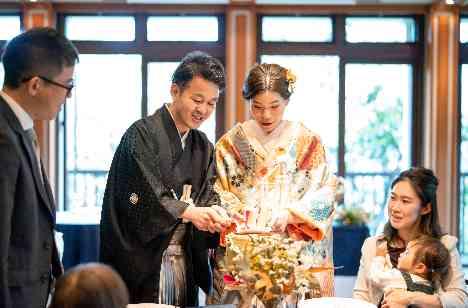 ゆったりと食事歓談のお時間をたっぷり取ったタイムテーブル。 せっかく集まってくださった皆様に楽しんでほしいと、 ゆったりしながらも、 色打掛にお色直しの時には各テーブルにミニ樽をセットし、鏡開きラウンドを! 樽の中にはおふたりのご出身地の銘菓やおすすめのお菓子を詰め、 どこまでもゲストに喜んでもらうための仕掛けが散りばめられた披露宴に。