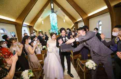 【いつくしみ深き】をみんなで歌うことが キリスト教式を選ばれた大きなご理由。 いままでの共通ご友人様のご結婚式でも みんなでしっかりと歌っていたそうです。 当日はコロナウイルスの関係でご参列が叶わなかった方々も リモートで繋いでご参加いただき、 ご退場の時にはおふたりがリモートの方々にも手を振られ ご新郎様は思わず涙も浮かべられてました。