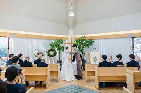 挙式は蘇州園近くにございます母の家ベテル教会で行いました。 涙あり、笑いありのセレモニーは おふたりらしさ満載の素敵な空間の中、蘇州園とは違った雰囲気をおふたりとゲストの皆様でお楽しみいただきました。 蘇州園では必ず蘇州園のチャペルで挙げないといけないというルールはございませんので、思い出の場所やこちらのおふたりのようにクリスマスのテーマに合わせて場所を選ばれるのも一つです。