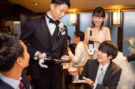 お色直しはせず、ゲストの皆様とのお時間を大切に過ごされました。 手作りのプロフィールDVDもゲストと一緒に見られ、 テーブルラウンドの際にはおふたりがご用意されたシャンパンやワインでおもてなしをされました。 結びはお手紙朗読ではなく親御様含めゲストの皆様へ向けたメッセージムービーをご用意され、 おふたりからの愛がたくさん伝わるあったかい空間に包まれました。