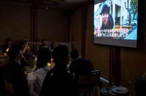 余興のお時間には新婦様のご友人からのメッセージムービーをご覧いただきました。新郎様はここで新婦様にサプライズでメッセージムービーに登場し、新婦様はまさかもらえると思っていなかったメッセージに大変驚ろかれ、涙を流されていました。 ゲストの皆様と同じ目線になり、おふたりのリビングルームで映画をご覧いただいているようなスタイルを蘇州園ではお楽しみいただけます。