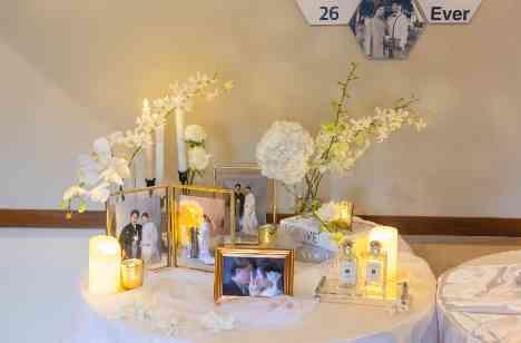 ゴールドと白を基調にしたウェルカムスペースは、ホテルライクな上質さを感じさせる洗練されたコーディネートに。すべておふたりが持ち込んだアイテムで丁寧に作り上げられており、細部までこだわりが光っていました。予算を抑えながらもセンスと工夫で叶えた空間は、ゲストを最初に迎える場所として印象的なひとときに。おふたりらしい美意識と想いが詰まった、特別なはじまりの空間となりました。