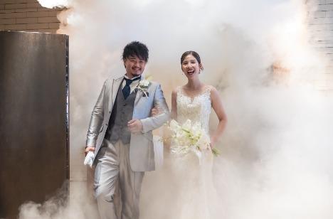 お色直しでは、和装からドレスへと装いを変え、スモークに包まれた幻想的な空間の中で再入場。ゆっくりと姿を現すおふたりに、会場からは思わず歓声が上がります。これまでの和やかな雰囲気から一転、ドラマティックで洗練されたシーンへと移り変わる印象的な瞬間に。衣装チェンジによる美しさと演出が重なり合い、ゲストの記憶に深く残る特別なワンシーンでした。