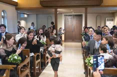 和装で執り行われた人前式では、おふたりのお子様がリングボーイとリングガールとして登場。小さな手で大切な指輪を運ぶ姿に、チャペルはあたたかな笑顔で包まれます。家族みんなで作り上げるセレモニーは、これまでの歩みとこれからの未来を優しくつなぐ時間に。ゲストに見守られながら交わされる誓いは、愛と絆の深さを感じさせるひとときとなりました。