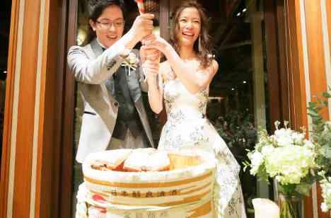 おふたりが進行の中でもこだわったポイントが 【鏡開き】です。贅沢に大きな酒樽をゲストの 祝福の掛け声とともに盛大にふるまいます。 和装ではなく、あえて洋装で。おふたりならではの想いも込めて。