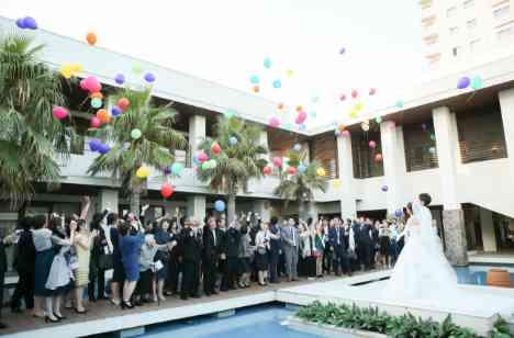演出でバルーンリリースやペンライトを使ったドレスの色当てをしました。。 ゲスト参加型の披露宴を作ることでゲストみんなが楽しめる披露宴になりました。 アクアテラスで行うバルーンセレモニーはどこにもない特別感を味わうことが できます!