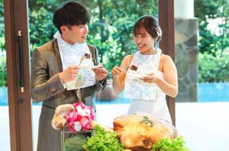 ファーストバイトはウエディングケーキではなく2人の好きなお肉でおこないました。おもてなしの面ではコース料理の後半にビュッフェ形式を取り入れ、デザートだけでなく「〆のご飯もの」まで用意したことで、ゲストの皆様にも大変喜んでいただけました。また披露宴の中でおこなった、じゃんけん列車もとても良い思い出です。