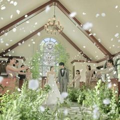 【木の温もりと自然光が輝く独立チャペル】緑に囲まれた石造りのチャペルはおふたりを祝福する音色が響き渡り、心温まるセレモニーが叶う。優しく差し込む陽光はステンドグラスを輝かせ花嫁姿を引き立たせる。