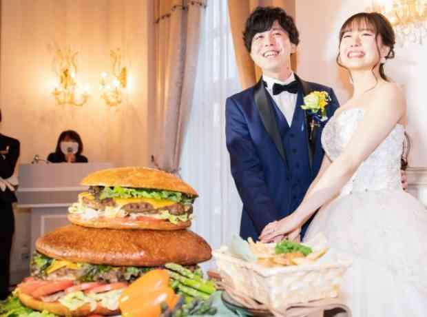 デザートビュッフェを長い時間楽しんでいただきたかったのと、その間にゲストと写真をたくさん撮りたかったので、自分たちの中で優先度の低い演出は省き、そこに時間を使えるように工夫しました。 また、デザートビュッフェをやることが決まっていたのであえてウェディングケーキ入刀はせず、BIGハンバーガー入刀にしました。