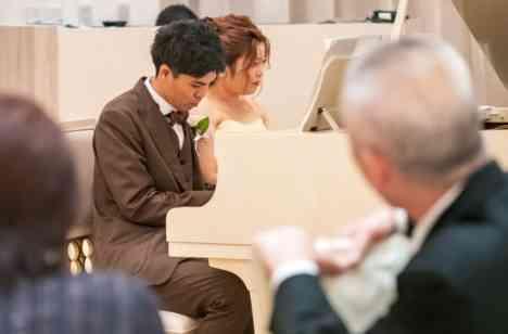 新婦が幼い頃から続けているピアノを演奏し、新郎もサプライズで新婦とともに連弾を披露することで、家族に感謝の気持ちを伝えられたと思います。 新婦の、推しのアーティストの写真や音楽などもいっぱいに詰め込んだ式にしました! 新郎のアクリルスタンドも作成し、推しのアクリルスタンドといっしょに会場を彩りました。