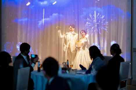 披露宴ではテーマパークの世界観を表現したながらも、誰もが笑えるような演出を…!と考えたのが蛍光塗料をゲストの顔に塗り暗闇でブラックライトをあてると光るという演出です!サンクスバイトからの流れで上手く持っていき、ゲストの驚きと笑顔を引き出すことができました!沢山のこだわりを詰め込み最後にはテーマパークのように花火を打ち上げました!