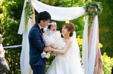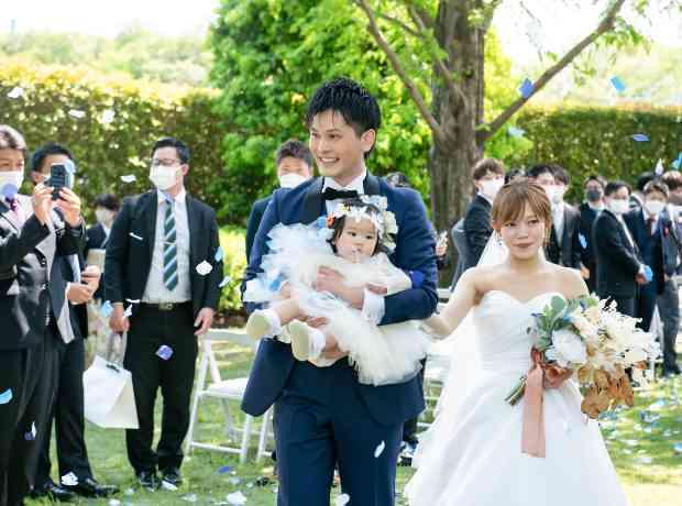 当日はお天気に恵まれ、晴天でガーデン挙式を迎えました。リングガールは一歳になったばかりの娘と愛犬にやってもらいました。 どうなるか不安でしたが、スタッフの方達がしっかりサポートして頂き和やかな雰囲気で無事に指輪を持って来ることができました。お色直し登場の際に妊娠発表と性別発表をしましたが、みんなのびっくりした反応を見るのがとても楽しかったです。