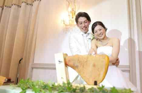 ケーキバイキングで沢山美味しいケーキが食べられるので、ウェディングケーキの代わりにお酒のテーマに合わせた生ハムを準備し、ケーキカットならぬ“生ハムのカット”で楽しく美味しい演出を自分たちも一番楽しみにしていました。