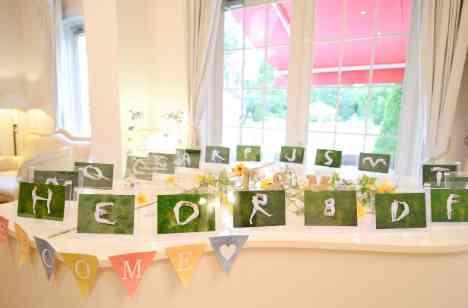 自分達らしさを盛り込んだ仕掛けですが、皆が目にする卓札を自分たちで、自分達の身体で表現することにしました(笑)全身白タイツを着用し、フェアブルームの綺麗な芝生の上で、アルファベットの人文字を作り卓札にしました。最初は気が付かなかったゲストの方々も見つけたときには皆笑顔になり、喜んでくれたと聞き、「身体を張って良かった」と思える瞬間でした。