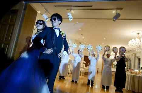 私たちが取り入れたのは『おたのしみビュッフェ』です。デザート、アイシングクッキー、季節のフルーツ、お茶漬けや常陸秋そば、私たちの大好きなラーメンなど。私たちはそれを『スーパー西村タイム』と名付け、踊りながらゲストの方達をビュッフェへとご案内しました。この演出の際にも、プランナーさんをはじめ、音響、照明、司会、沢山の方々にアイデアをいただきご協力をいただいた結果、皆を驚かせることができました。