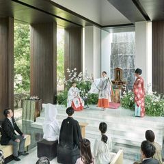 水と緑に囲まれた光注ぐ挙式会場。正面には滝が流れております。神秘的かつ落ち着いた雰囲気で行う麗風での挙式会場を実際にご見学していただきながらご案内させていただきます。
