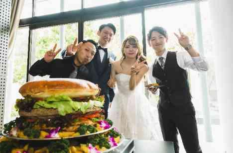 こだわったポイントは、ウェディングケーキをハンバーガーにした事です! "他と被らない" "沖縄感を出したい"と相談したところ、プロデューサーの清水さんから、大きいハンバーガーとかどうですか? と提案していただき、即決しました!笑 ゲストのみんなにもそのままハンバーグハンバーガーを食べてもらい、面白かったなどのコメントを頂きました!