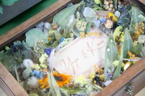 【ゲストと一緒に創り上げたい】そんな私たちの気持ちを汲んでプロデューサーさんが提案してくださった、ドライフラワーの結婚証明書。大切な宝物になりました。またゲストと新郎新婦の距離を近くに歓談の時間を多く設け、ゲストへのプレゼント企画を用意しました。つくばにちなんだ商品をパネルで用意し、写真撮影やゲスト一人一人と話す時間をたくさん楽しむことができました。