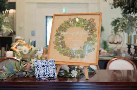 新婦が手編みしたウェディングドレスを着用。ゲストもお揃いの編み物ブローチをつけ、ウェルカムスペースも編み物で統一。お色直し再入場は、新婦が好きなアーティストのウェディングソングで幸福感いっぱいに。ペーパーアイテムはチャペル内装に合わせたグリーンデザイン。ウェルカムボードは友人によるオリジナルイラスト、プロフィールムービーは新郎の自作で、手作り感あふれる温かい式になりました。