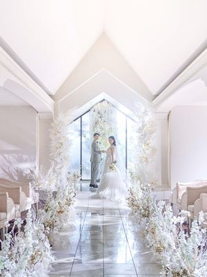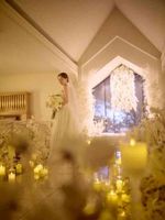 真っ白なチャペルでは、照明を落とし光をあえて抑え、キャンドルをコーディネートすることで、幻想的な空間の演出も可能です。100本以上のキャンドルに包まれた厳かな雰囲気の中、おふたりが紡ぐ一生の誓いは、ゲストとおふたりの心に深く刻まれることでしょう。