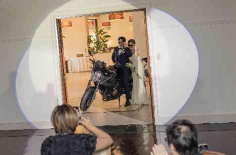 披露宴入場では、彼がバイクに乗るため、 バイクを使った入場をしました。 安全性の面からバイクを走らせることは出来ませんでしたが、エンジン音を鳴らしインパクトのある演出をすることができました。 他にも、イベントにも力を入れ、「刺身の格付けチェック」を行い、アイマスクや札、曲を番組で使用しているものを真似て、忠実に再現しました。