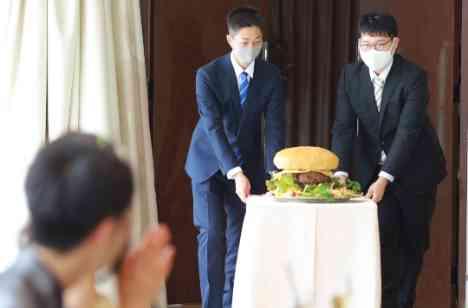 このご時世なかなか旅行にいくこともできないからこそ、ゲストの皆さまにはハワイのようなリゾート地に来たような感じを味わってもらえるよう、ウクレレやキャリーケースをもって入場したり、ウエディングケーキの代わりに巨大なハワイアンバーガーを用意したりしました。ハンバーガーが登場した時には、ゲストからは「今までこんなの見たことがない!」という驚きの声が上がっていました。