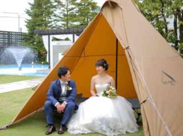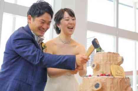 二人とも大好きなアウトドアやキャンプを取り入れたいと思い、いろいろなシーンに盛り込みました。 ガーデンには本格的なテントを飾り、キャンプに来たような雰囲気を創りました。 また、薪をイメージしたウエディングケーキには本物の斧で入刀し、ファーストバイトもキャンプらしくスコップを使用しました。