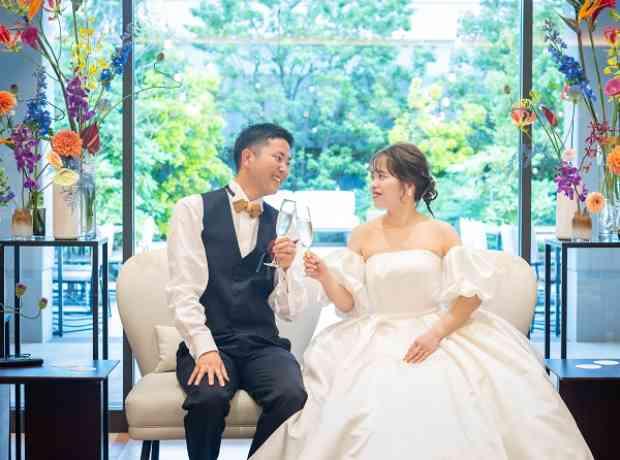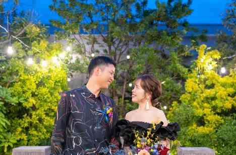 披露宴会場の装花は、ブラックのカラードレスを着たかったためそのドレスが最大限に引き立つように会場をカラフルにしました。美術館のようにしたかったので、装荷にはこだわりました。 お料理についてもゲストに楽しんでもらえるため、満足してもらえるために、お料理のお打合せで料理長と一緒に自分たちで料理を組み合わせて考えました。