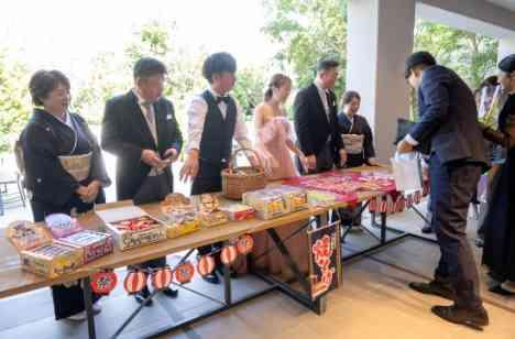 アイテムに関してはウェルカムスペース、 結婚証明書、サプライズリングボックス、 記念品贈呈、プチギフトです。進行に関しては来てくださったゲストの方に暇な時間を与えないよう、 なるべく多くの催しを計画しました。 結びのプチギフトでは年齢問わず楽しめる駄菓子屋さんをイメージしました。 みんな幼少期を思い出しながら、 何を取るか悩んで楽しんでいる姿を見て 準備して良かったなと思いました!