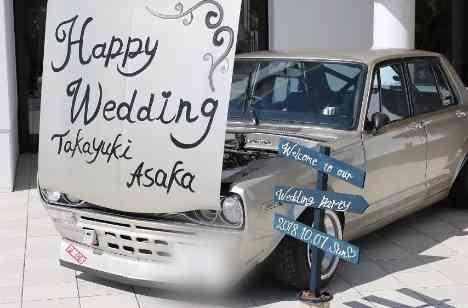 会場にウェルカムカーとして、大好きなハコスカを置かせていただきました。ハコスカにもインパクトのあるペイントを自分達で行い、みんなからも2人らしいというお言葉をいただきました。 ウェルカムスペースには手作りのボードと写真がゲストの皆さんをお出迎え! 受付を済ませると私たちの思い出の写真を壁一面に貼りました。足を止めて見てくださるゲストの方々が多く嬉しかったです。