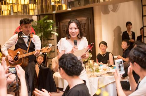 普通のお色直し入場はしたくない!という新婦の強い希望で(笑)、新郎はてんとう虫の格好をしながらギターを弾き、新婦が「てんとう虫のサンバ」を歌いながら入場し、会場を練り歩くという、皆を驚かせる演出を考えました。