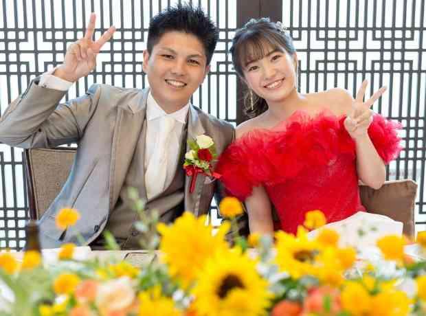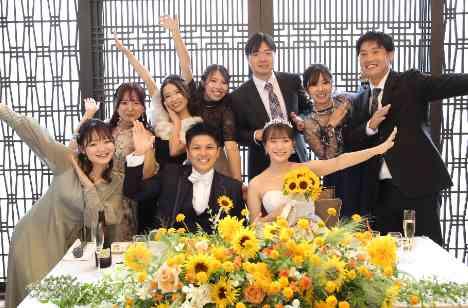 会場内は、洋だけでなく和の要素が取り入れられているのが魅力的でした。 私たちはふたりとも夏生まれであり、挙式も夏だったので、装花はひまわりをメインにした夏らしいコーディネートにしました。 ひまわりは一種類だけではなく、様々な種類を用意していただき、爽やかさを出すためにグリーンを入れたのがポイントです。 当日は自分たちが想像していたよりもはるかに素敵な仕上がりで、本当に良かったと思いました。