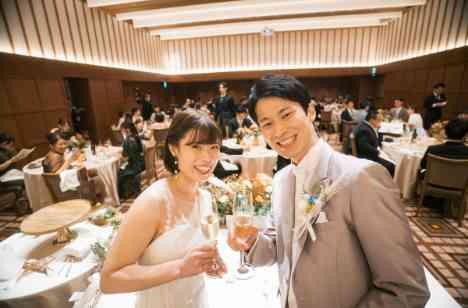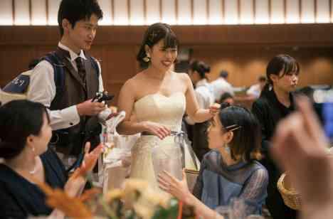 挙式の時と雰囲気を変えたかったので、あえて東京タワーが見えない会場を選んだのがポイントです。 テーブルラウンドでは、夫がビールサーバーを背負ってビールサーブを行いながら、私の地元の銘菓であるハラダのワインに合うラスクをおつまみとして配りました。また、ゲストに気持ち良くお酒を飲んでもらえるよう、化粧室にウコンを設置したり、プチギフトには、チェイサーとしてサンクスウォーターをお渡ししたりしました。