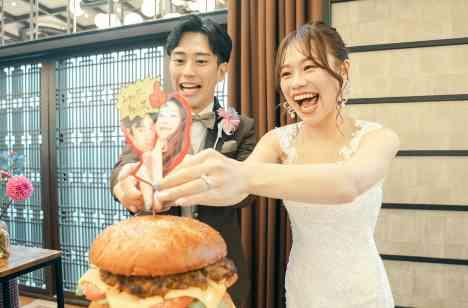 個性が出そうなところは全てこだわりました。具体的には、ドレス・アクセサリー・装花・ウェディングケーキ代わりの巨大ハンバーガー・自作プロフィールムービーなどです。特に一から自作したプロフィールブックは思いがこもった作品になりました。ゲストとの思い出の写真も入れ、最後のページには、一人ひとりに向けて手書きのメッセージを書き添え、その人だけのプロフィールブックになるように工夫しています。