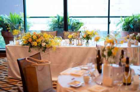 披露宴会場は、東京タワーの足元が見え、テラスがあるため、外の空気を感じることができるのがよかったです。 会場の雰囲気に合わせて、自然を取り入れた可愛らしいナチュラルな空間にしたかったので、 装花はイメージカラーの黄色をベースに、黄色・白・緑でお願いしました。 当日は想像以上の可愛さとナチュラルな雰囲気で、私たちにぴったりな装花で感動しました!