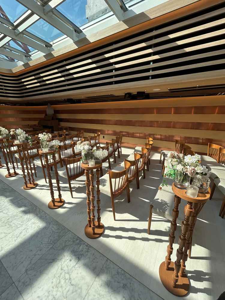 昼間に見学したのですが、チャペルはとても明るく外にいるみたいな開放感で素敵でした。また生演奏で挙式できるとのことで素敵な雰囲気の中挙式できると思います。
