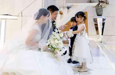 入場時は緊張されていたおふたりですが、お式が進むにつれて少しづつ緊張も解れてきたご様子。そんな時に可愛らしいリングガールちゃん、リングボーイくんの登場でチャペル内は一気に温かい雰囲気に。長いヴァージンロードを一歩一歩と歩いてくるお姿におふたりもたまらず笑顔に。無事おふたりの元へとたどり着き指輪を渡す光景はゲストの皆様もカメラを構えておられました。