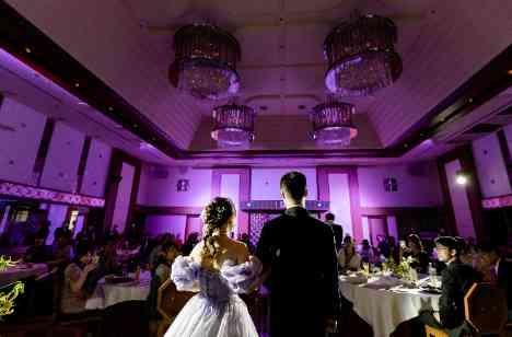 おふたりがお選びになった披露宴会場は「The Suite Jazz]。日本で最初にジャズが演奏されたのが神戸とされており、その名の通りジャズミュージックに相応しい豪華な装飾とシックな雰囲気がおふたりのパーティーに華を添えます。照明やテーブルコーディネートによっても雰囲気が変わる会場のため、会場もおふたり色に染まっておりました。