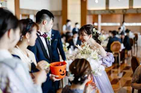ゲスト様との歓談のお時間におふたりがお持ちになっていたのは、カボチャの箱に入ったたくさんの贈り物。ハロウィンの季節だったこともあり、おふたりからの贈り物にゲストの皆様も喜ばれておりました。またせっかくお越しいただいたゲスト様とお話ししたり沢山お写真を撮りたいと仰っていたおふたり。一生に一度の今日という日をゲストの皆様とご一緒に楽しまれておられました。