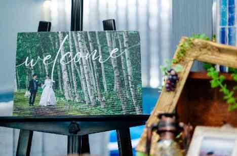 一生に一度の日だからこそお越しいただくゲスト様にめいいっぱい楽しんでほしい!そのような想いからラウンジ内のスペースにはおふたりらしさ溢れる飾りつけが盛り沢山。ゲストの皆様もおふたりのご用意したお写真や飾りをご覧になりながら歓談に華を咲かせておりました。中でもプライベートラウンジの雰囲気に合わせたさしわやかな印象のウェルカムボードはこれから始まるおふたりの披露宴へとゲスト様を導いているようでした。