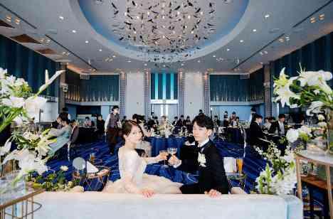 おふたりがお選びになった会場は「The Suite Grand Blue」。海をイメージしたさわやかな印象の会場でアットホームな雰囲気のソファーコーデをお選びに。おふたりとゲスト様の間を隔てるものがない上にドレスやタキシードがお足元まで見えるのも魅力。ゲストの皆様もおふたりのソファーの周りに集まりお写真やご歓談を楽しんでおられました。