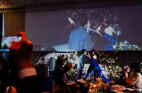 全披露宴会場に設置している巨大なスクリーンはおふたりの貴重な瞬間をゲストの皆様にもしっかりと見ていただけるようライブカメラを投影。皆様から向けられるカメラに緊張しながら、またどこか恥ずかしさもありながら新婦様からの甘い一口を。披露宴の定番セレモニーでもあるファーストバイトは皆様からの絶好の撮影チャンスです!