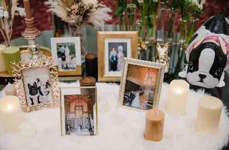 披露宴会場の前にあるプライベートラウンジではおふたりの大好きな愛犬や前撮り時のお写真などたくさんの想い出を飾られていました。おふたりとゲスト様だけのプライベート空間だからこそできる、おふたりらしい飾りつけ。ゲストの皆様もウェルカムドリンクを手に取りながら、おふたりのお写真や飾りつけをご覧になって歓談を楽しまれていました。